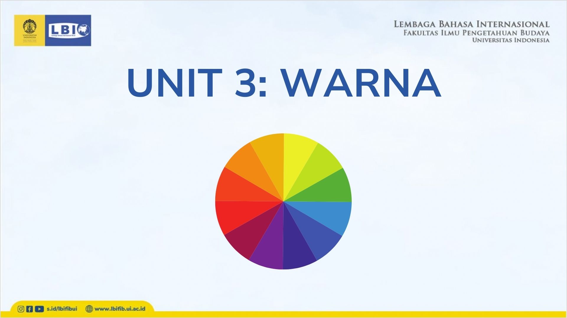 Pada unit ini, Anda akan belajar tentang kosakata warna. Anda juga dapat berlatih menggunakan kosakata tersebut dalam struktur kalimat sederhana yang sering digunakan sehari-hari.